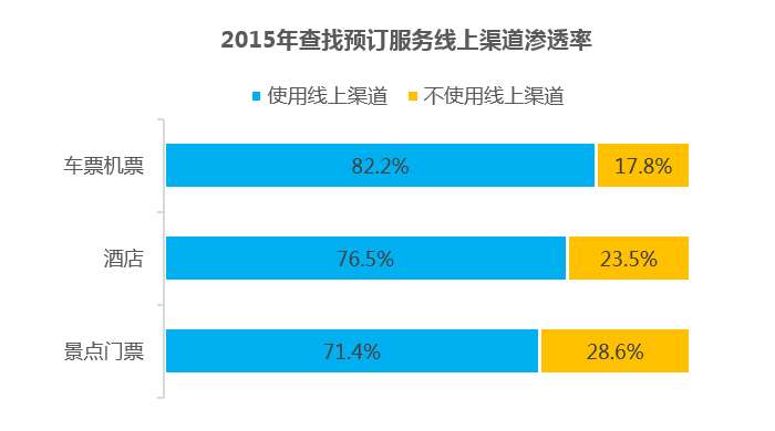机票车票预订、酒店预订和景点门票预订,作为产生资金沉淀的业务,成为在线旅游各产品追逐的中原之鹿。车票机票和酒店在线预订渗透率均超过四分之三,景点门票预订相对而言发展空间更大。