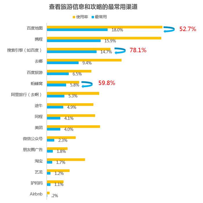 通过计算使用渠道到最常用渠道的转化率发现,搜索引擎、蚂蜂窝和百度地图转化率最高,蚂蜂窝用户粘度表现突出。