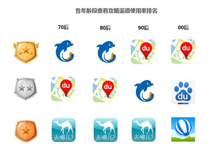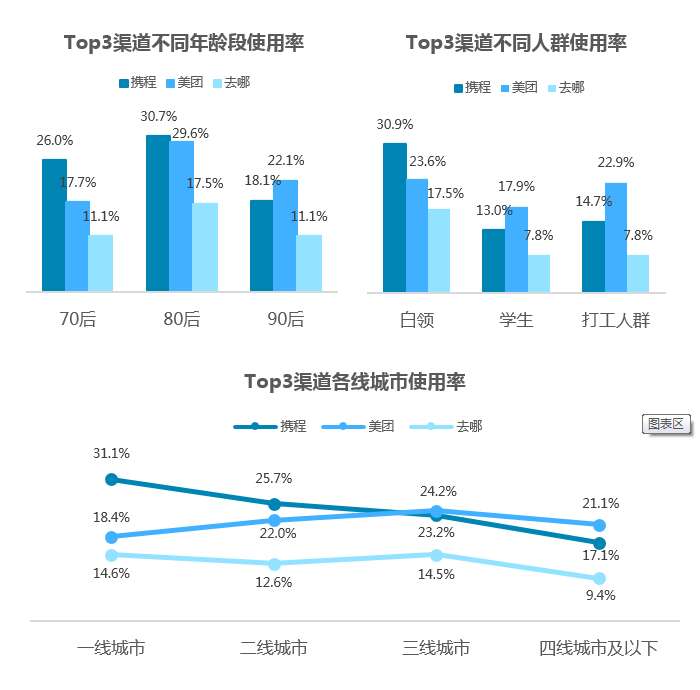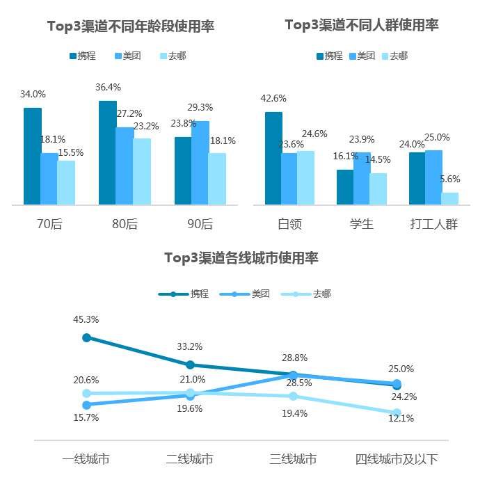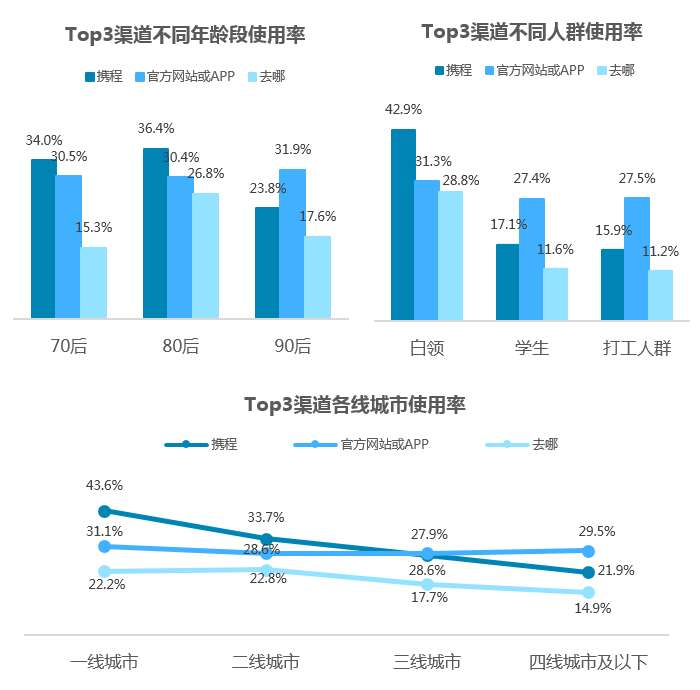 官方渠道在不同人群中使用率非常稳定。携程和去哪分布有一致趋势,在一二线和白领人群中更受欢迎。