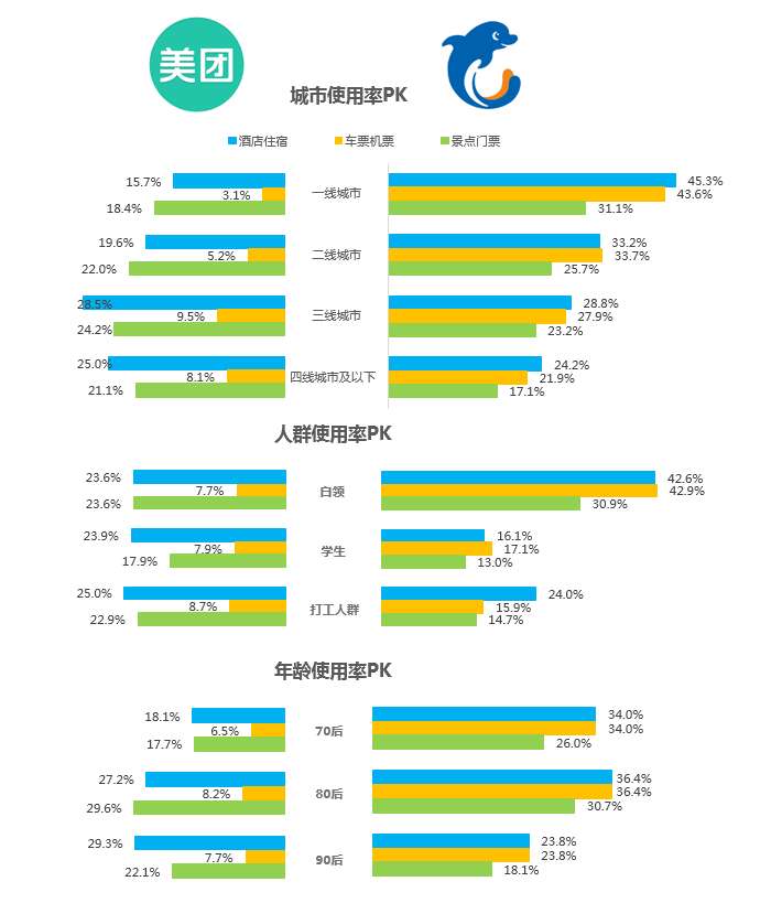 美团则早已不仅是餐饮类团购巨头,在旅游预订市场也坐拥一席之地。凭借其团购服务在三四城市的高渗透率,在差异化旅游市场占有先机。美团在三四线城市、学生用户和打工用户、90后用户中拥有很高的使用率。