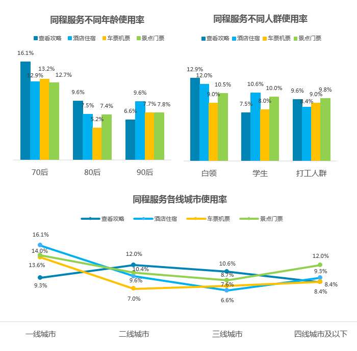 同程旅游的在线预订服务在一线和四线用户中渗透率较高,而攻略类服务在二线城市渗透率较高。同程在出游比例最高的70后用户中渗透率显著高于其他年龄段用户。