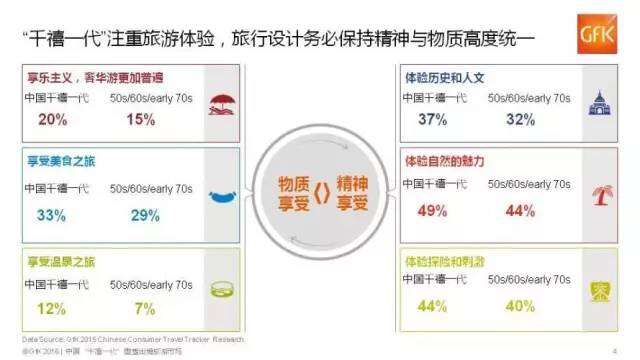 中国“千禧一代”出境旅游注重体验,旅行设计务必注重精神享受与物质享受双统一。一方面他们渴望享受奢华游(15%),在旅行中享受美食诱惑(33%);另一方面文化熏陶必不可少,体验历史和人文(37%)、体验自然的魅力(49%)、体验探险和刺激(44%)。
