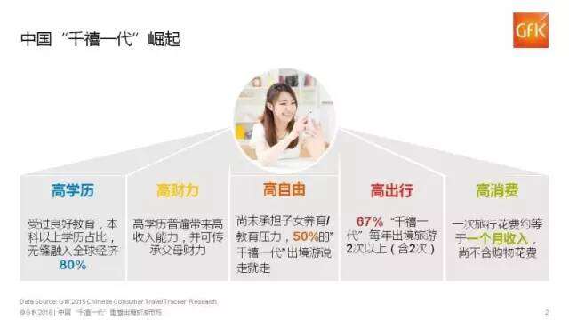 “千禧一代”一词起源于美国,中国“千禧一代” 指1980-1995年出生的第一代独生子女人群,占中国总人口比例约25%,占中国出境游人口比例达73%。是当今及未来十年中国出境旅游市场乃至社会的中坚力量。