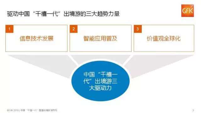 信息技术发展、智能应用普及和价值观全球化是驱动中国”千禧一代“出境旅游的主要动机。中国“千禧一代”是伴随互联网行业共同成长的一代,信息、技术和智能设备是他们生而携带的武器;他们的成长中受到全球价值观影响:生命在于体验,进取,享受和自由,不惧冒险。