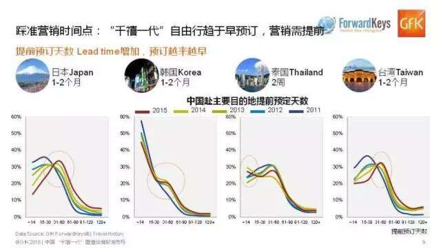 踩准营销时间点:“千禧一代”自由行/自助游趋于早预订,营销需提前。赴日和赴台旅行提前预订时长提前到1-2个月;赴韩旅行预订主要提前一个月内完成,但仍呈现出继续提前的趋势。