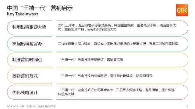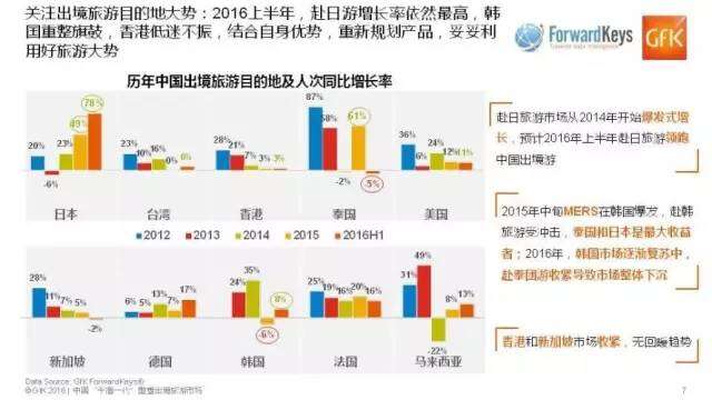关注出境旅游目的地大势:2016上半年,赴日游增长率依然最高(78%),韩国重整旗鼓(8%),香港低迷不振(3%),结合自身优势,重新规划产品,妥妥利用好旅游大势。