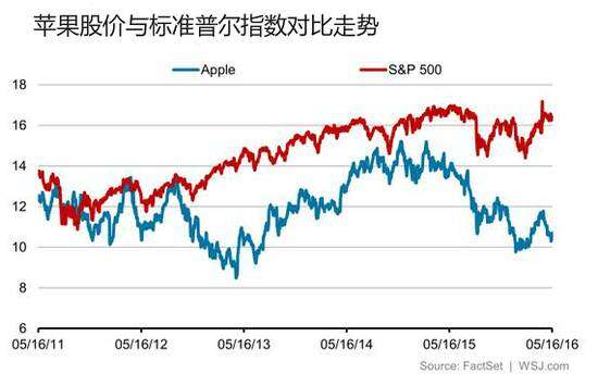 (图片说明:过去五年苹果和标普的走势对比,来源:华尔街日报)