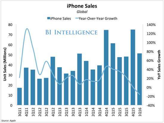 - iPhone,从去年年初开始,增长率就一蹶不振……