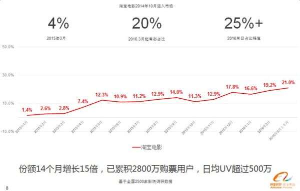 图注:淘宝电影的融资PPT中披露,其购票用户数达2800万,市场份额稳定在20%以上