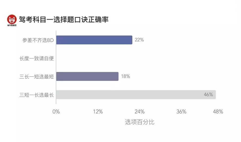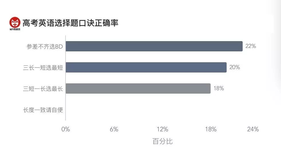然而事实上,由于三长一短拖了后腿,该口诀的综合正确率仅为21%(长度一致的不计入题目总数,下同),比高考英语高出1个百分点。