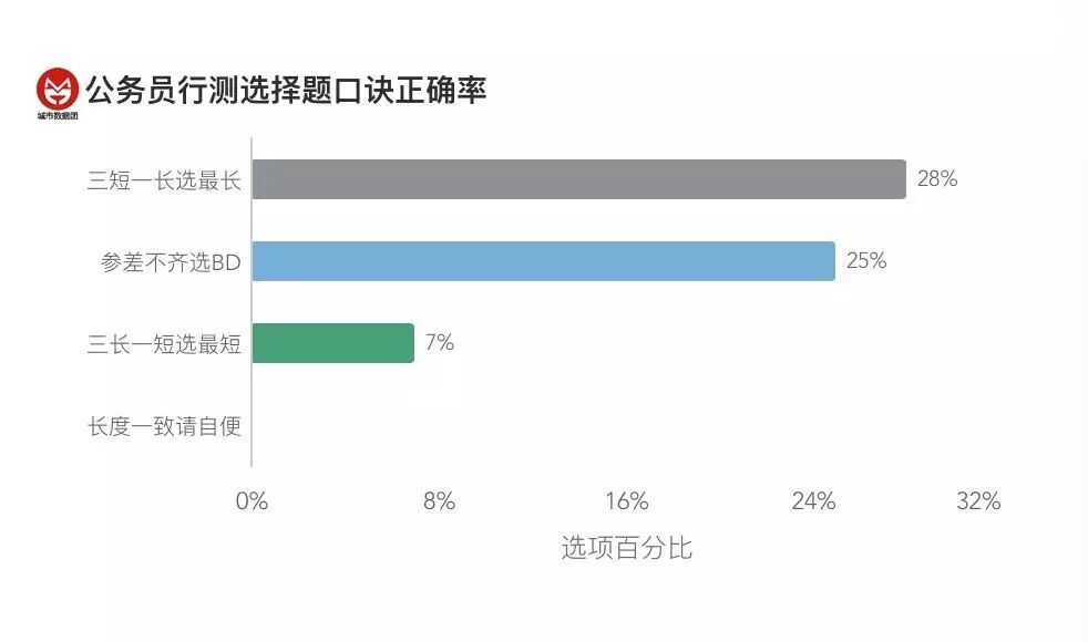 而从口诀的正确率来看,却呈现出有趣的现象:三短一长选最长的正确率达到28%,参差不齐选BD的正确率也到达了随机的25%水平。四句口诀居然对了三句!