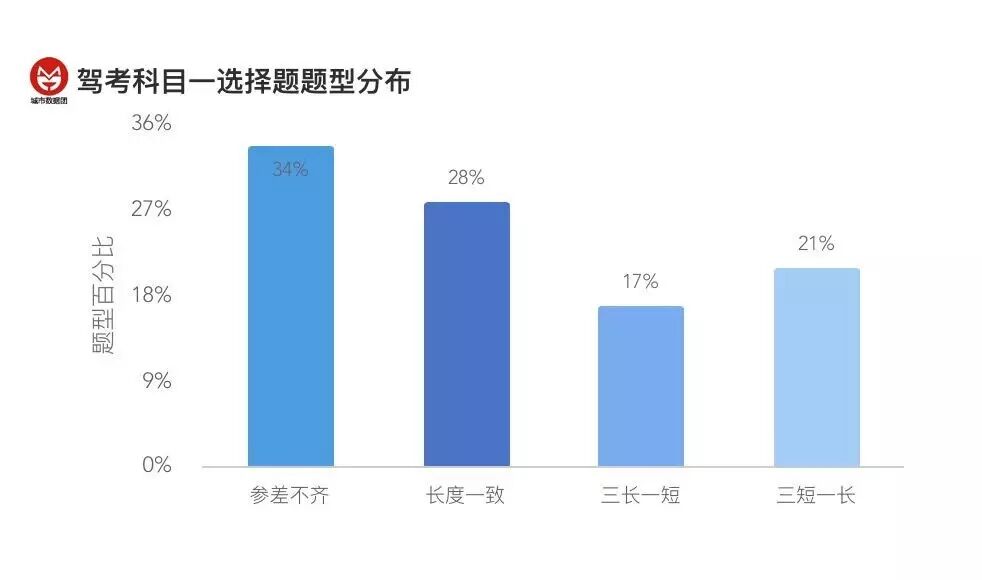 如图所示,接近半数题目都属于参差不齐类,三短一长、三长一短各有分布,而可能是英语这个学科的特殊性,长度一致的题目少到可以忽略。