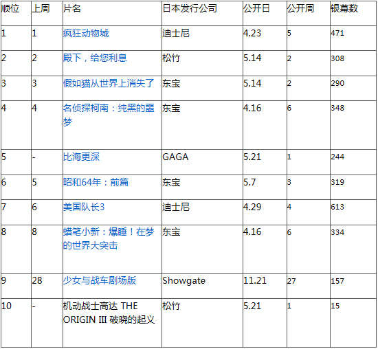 来自迪士尼的《疯狂动物城》上周末无悬念再度保住了冠军位,此外,有两部上榜新片——是枝裕和导演新片《比海更深》与本土动画《机动战士高达 THE ORIGIN III 破晓的起义》。