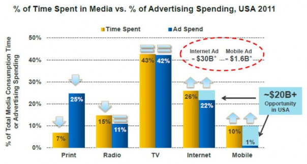 此图展示的是不同媒体形式(平面媒体、电视、互联网及移动终端)用户的消费时间及广告商的投入情况。虽然存在一定的重合(比方说大多数报纸都有含广告的网站),但是媒体的消费时间和广告收入相对比的差距还是相当大的。这个数字就很说明问题:尽管大家花在报纸杂志上面的时间少于10%,但广告商在平面媒体的投入仍达到25%。乐观的看法是平面媒体的广告效率要比其他媒体形式高。
