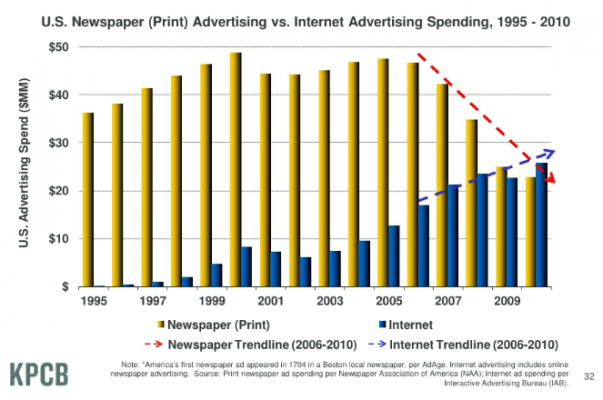 在互联网无所不在的今天,各个媒体都开始拥抱在线世界,但是鲜有人放弃传统的报纸。凯鹏华盈的资深互联网分析师,被称为“互联网女皇”的Mary Meeker的一张片子说明了问题:其原因在于平面媒体仍然是广告收入的重要来源。但此图还反映出了为什么传统的平面媒体为什么对未来恐惧:因为这个财源正在快速萎缩。