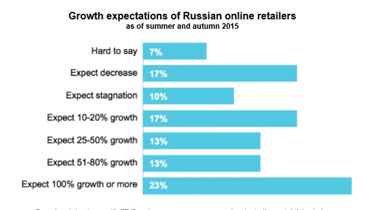 根据East-West Digital News在今年3月公布的市场数据可以看到,2015年俄罗斯国内电商销售数据为6500亿卢布,相比2014年有16%的增长,平均订单价也由3750卢布增长为4050卢布,但即使销售额连续多年快递成长,目前仍然只占俄罗斯整体零售额的2%。业内人士预测在将来的5到10年,俄罗斯电商销售额将继续保持高速发展的趋势。在2015年秋季针对电商企业的调查中,49%的企业预期未来营业额可获得25%以上的增长,其中更有23%的企业预期获得100%或以上的增长。伴随着俄罗斯电商市场的蓬勃发展及中国政府对于品牌走出国门的政策支持,越来越多的国内品牌商已经进入俄罗斯市场。由于俄罗斯在轻工业方面的基础薄弱,因此中国品牌商很快就凭借丰富的产品线及价格优势,在俄本土获得了一席之地。