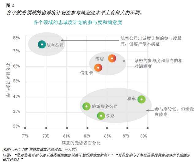 在这种情况下,旅游忠诚度计划可能成为竞争力的必要条件之一,因为如果没有这些计划,航空公司、租车公司或酒店的份额可能会流失,转移到能够为旅客提供此类计划的提供商。例如,与酒店、信用卡、租车、铁路和旅游服务公司的忠诚度计划相比,航空公司的忠诚度计划虽然可以提供最大折扣并拥用消费者最大参与度,但它也是消费者最不满意的计划(见图 2)。从这个角度来说,迎合这一趋势的航空公司忠诚度计划可能会被视为折扣方案,而非可构建客户忠诚度的机制。