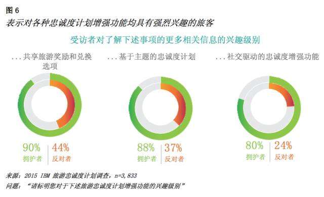为了解旅游忠诚度计划会员对计划回报方面的预期,我们要求受访者对若干简单概念的兴趣级别进行评级(见图 6)。我们发现,尽管忠诚度计划拥护者和反对者的兴趣级别存在差异(拥护者对各种新计划均十分感兴趣),但两者均对我们提议的三项计划修改主张中的两项表现出了一定的兴趣。