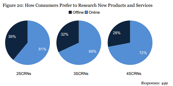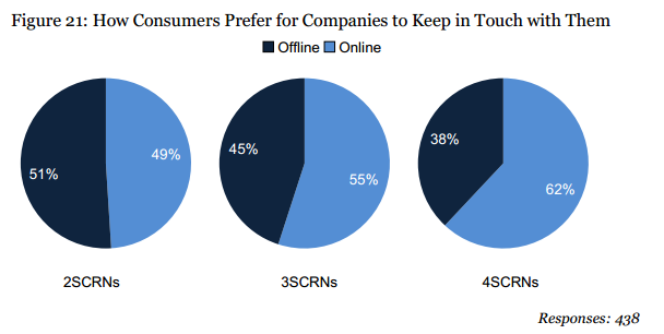 根据eConsultancy为iAB执行的研究,消费者使用的屏幕越多,他们在线发现和研究产品的可能性就越高,75%的两屏用户将线下渠道如口碑,目录和电视列为主要的新产品信息获取渠道,而在四屏用户中,该比例下降至63%。而且用户使用的屏幕越多,他们在购买后喜欢品牌通过线上渠道与他们沟通的意愿也更高。