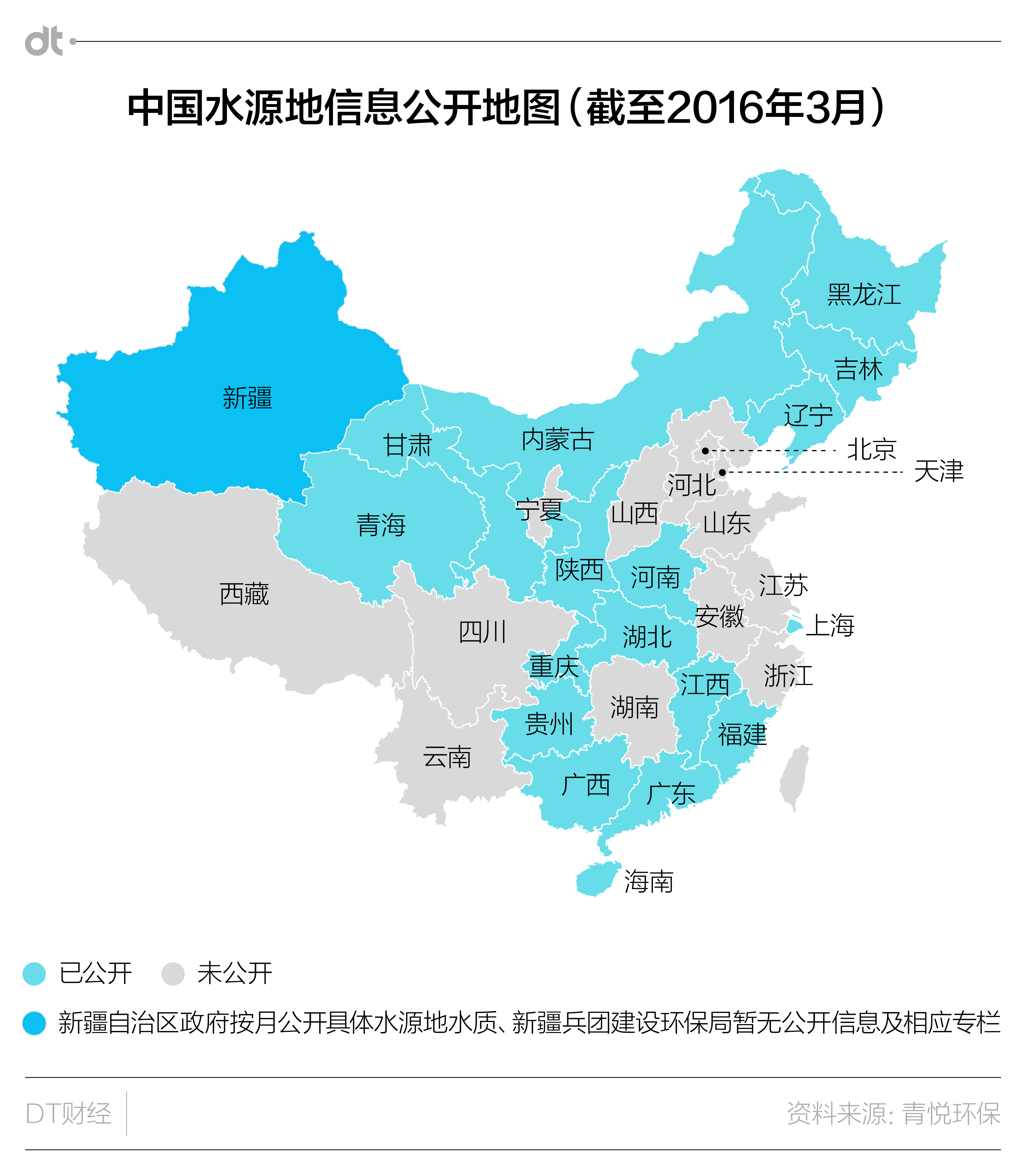 环保部在今年1月份已经要求各地进行水源地信息公开工作,截至5月末,根据青悦环保的统计,除港澳台外,全国有19个省级单位公开了监测数据,13个未公开。