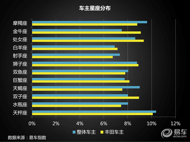没错!就是星座分布!我们查阅了2015年全年上牌用户中丰田车主的生日数据,发现丰田车主中天秤座、处女座、金牛座、摩羯座的比例明显偏高。
