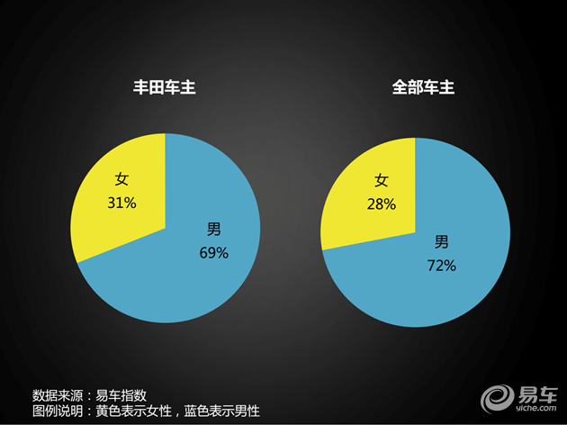 丰田车主中,女车主的比例只是略高于总体水平,没达到宝马车主接近一半都是女性的地步,这个比例依旧保持中庸主流,依旧是大叔级男司机占主导地位。