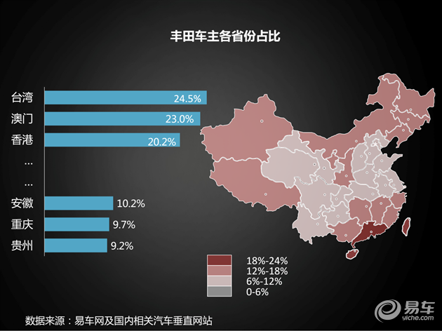 北方省份其实对丰田品牌也颇为认同,东三省、内蒙、陕西和宁夏的关注用户比例都不低,似乎可以理解为一汽与丰田的合资导致对这些优势市场的辐射。
