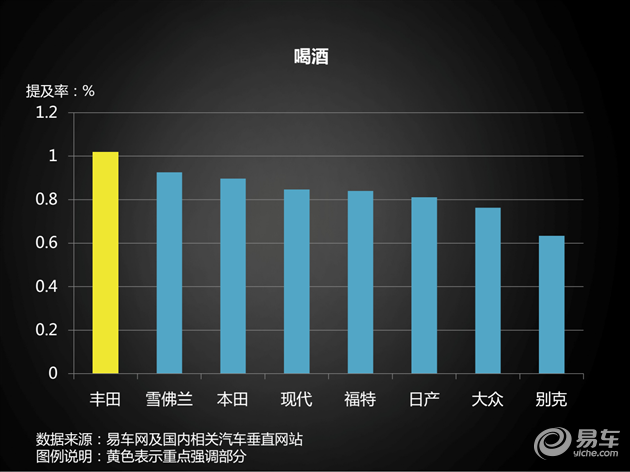 看来丰田车主当中,甜咸豆腐脑都应该挺受欢迎,这种“边疆”省份为主的分布态势,还带来一个好处,就是丰田车主比较爱喝酒……与其他合资品牌相比,丰田车型论坛中有超过1%的用户提到了喝酒,而其他品牌车主的提及率均不到1%。