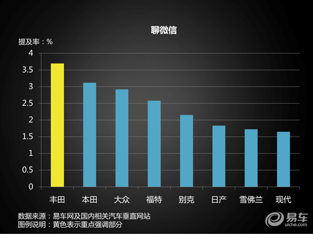 丰田车主对微信相关关键词接近4%左右的提及率,远远高于其他几个品牌的车主,微信+中年,丰田4S店可以考虑在微信朋友圈多推一点“买丰田车必须知道的10个秘密”之类的文章……