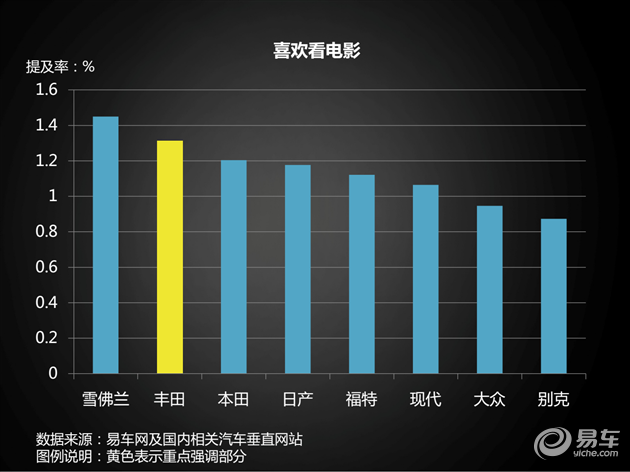 或许也可以换个角度理解,丰田车主似乎比较享受生活,通过对电影方面相关关键词的统计,我们还发现丰田车主对电影也表现出了极高的热情。