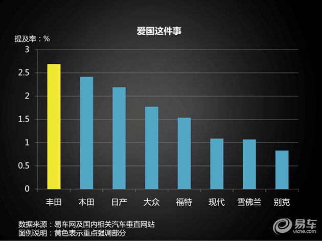 结果是……在丰田品牌车型的论坛里网友提及爱国这件事的比例之高令人发指!紧随其后的是本田和日产的论坛,前三名都被日系车论坛牢牢占据!
