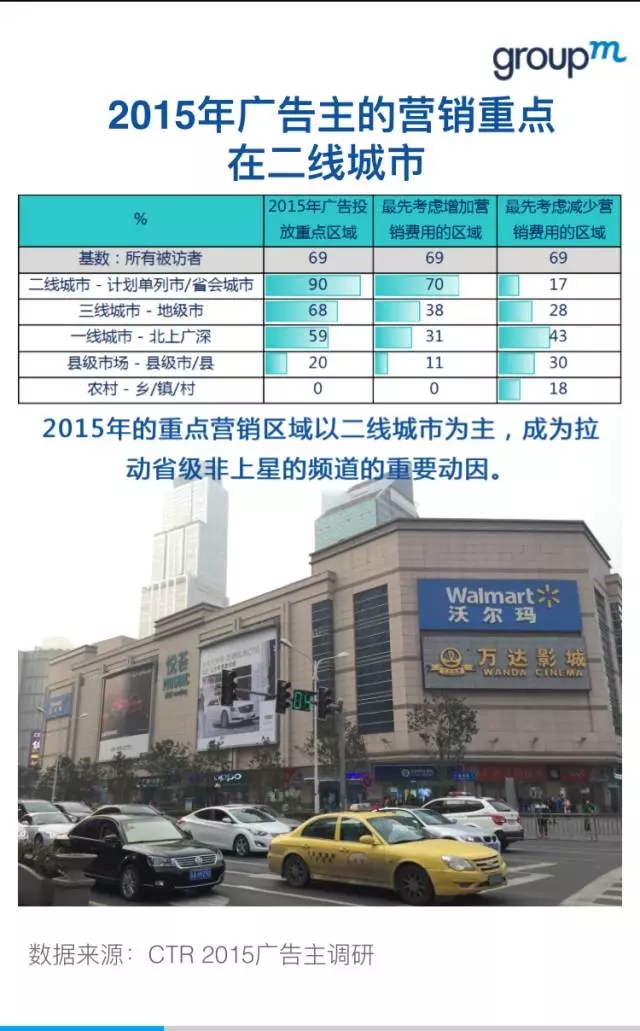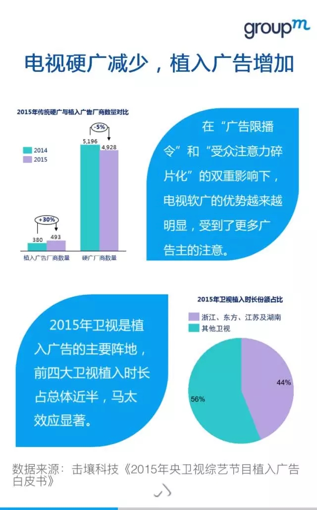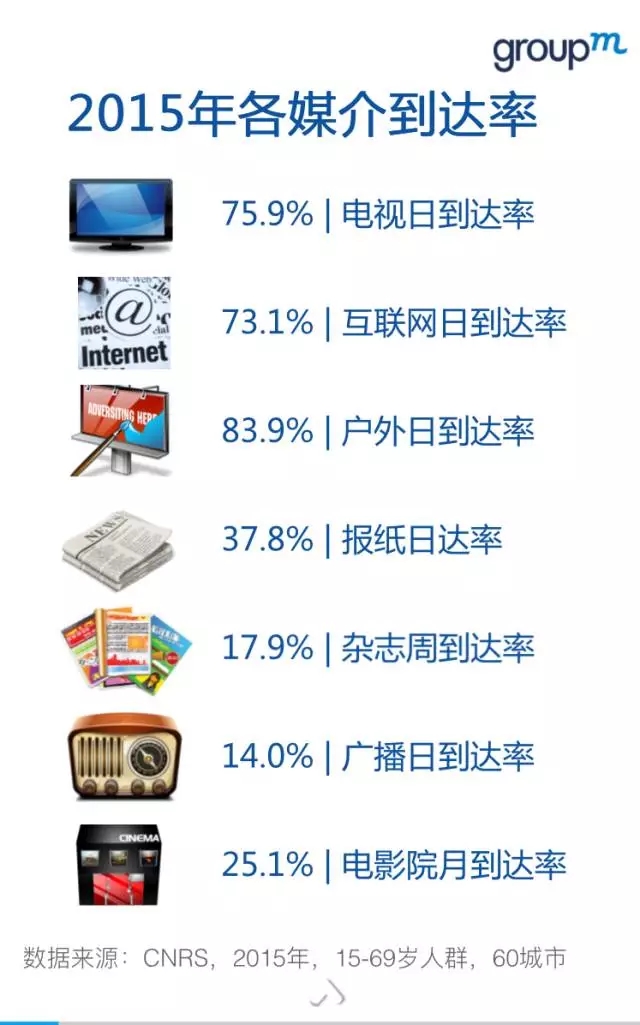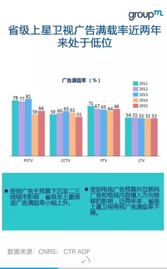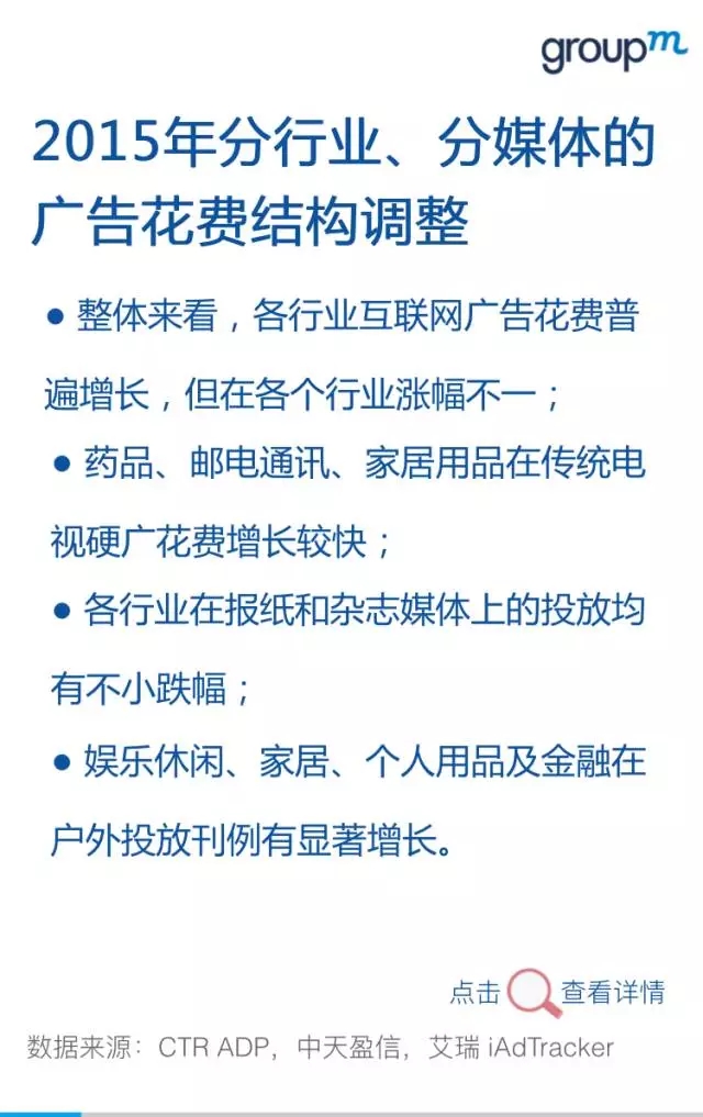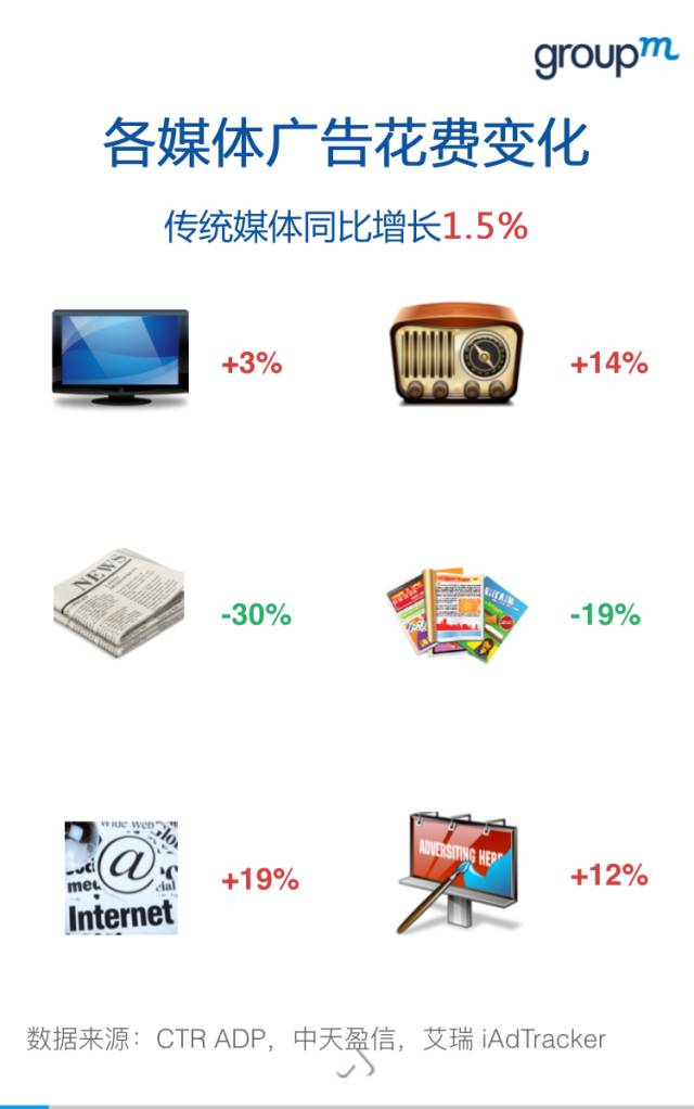 中国媒体市场概览(2015全年回顾) 群邑智库日前发布《中国媒体市场概览(2015全年回顾)》,部分数据如下: ► 报纸下降30%,杂志下降19% ► 软广植入花费增长迅猛 ► 互联网增长19%,视频网站付费会员增加迅猛 ► 移动程序化购买进入发展高潮 更多阅读:中国媒体市场概览2016全年回顾凯络:2016 年中国媒体市场景观CTR:2022中国媒体市场趋势Coresight Research:2023年美国零售媒体市场报告Crunchbase:2018年中国初创企业已经获得938亿美元投资在中国,只抓一个权健是不够的社科院:2015年中国自驾游年度发展报告大众点评:2015年中国烧烤大数据报告凯络:2015中国跨境网购报告顺历:2015年中国择日习俗调查报告武书连:2015年中国大学排行榜2015年中国现场音乐产业调查工程师爸爸:2015年中国儿童听书报告北京师范大学:2015中国劳动力市场发展报告国旅运通:2015年度中国商旅调查