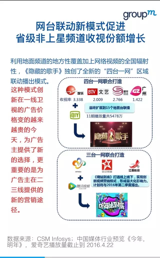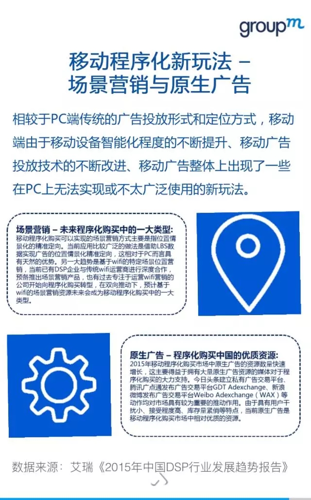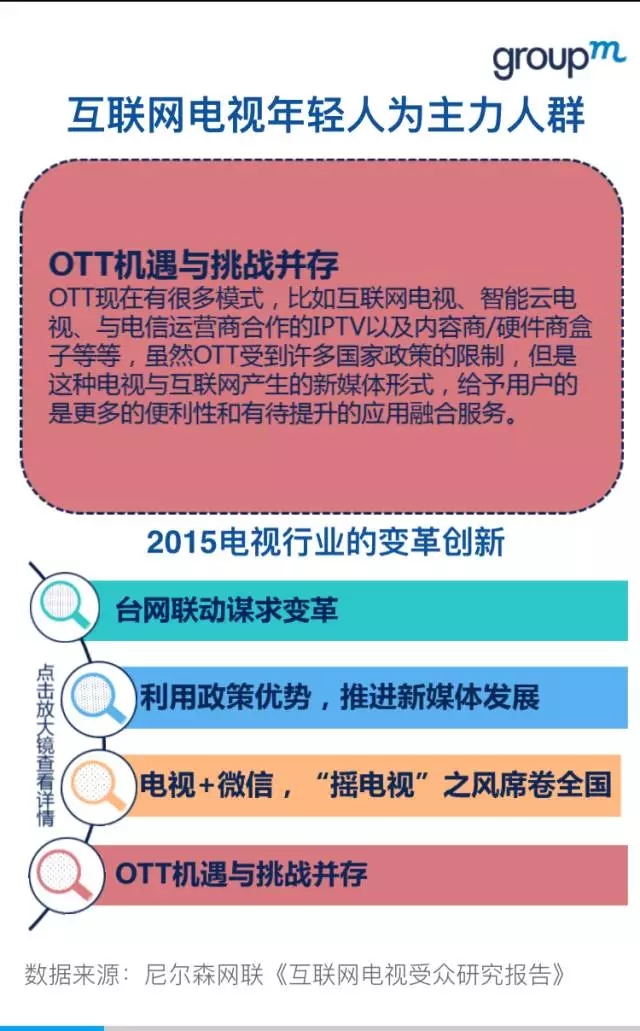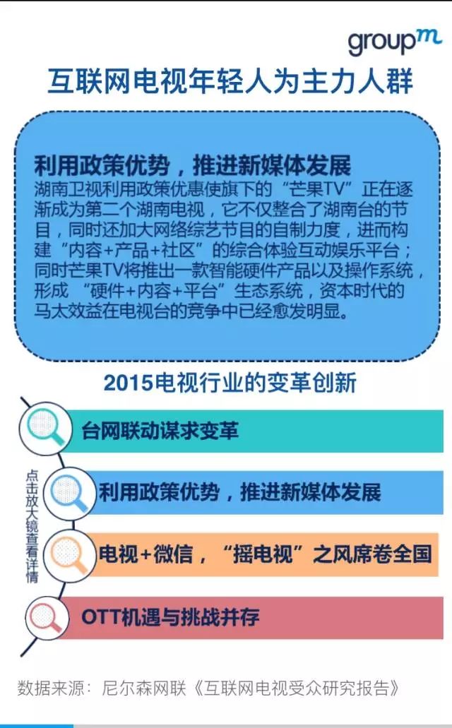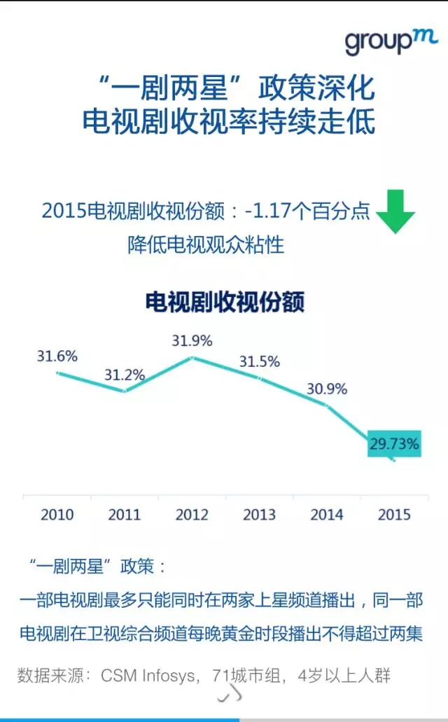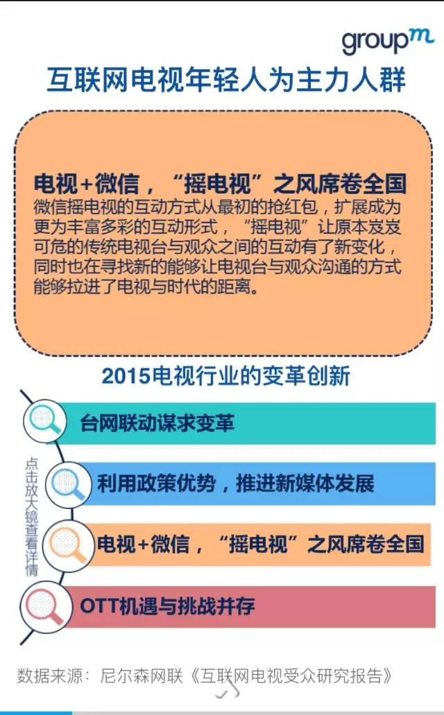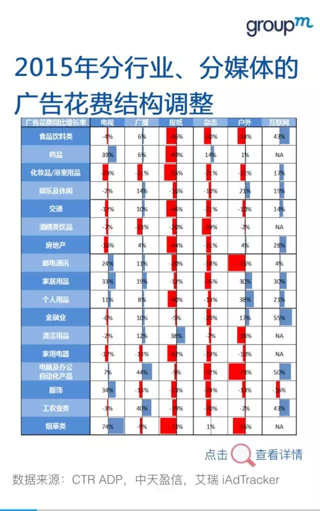 中国媒体市场概览(2015全年回顾) 群邑智库日前发布《中国媒体市场概览(2015全年回顾)》,部分数据如下: ► 报纸下降30%,杂志下降19% ► 软广植入花费增长迅猛 ► 互联网增长19%,视频网站付费会员增加迅猛 ► 移动程序化购买进入发展高潮 更多阅读:中国媒体市场概览2016全年回顾凯络:2016 年中国媒体市场景观CTR:2022中国媒体市场趋势Coresight Research:2023年美国零售媒体市场报告Crunchbase:2018年中国初创企业已经获得938亿美元投资在中国,只抓一个权健是不够的社科院:2015年中国自驾游年度发展报告大众点评:2015年中国烧烤大数据报告凯络:2015中国跨境网购报告顺历:2015年中国择日习俗调查报告武书连:2015年中国大学排行榜2015年中国现场音乐产业调查工程师爸爸:2015年中国儿童听书报告北京师范大学:2015中国劳动力市场发展报告国旅运通:2015年度中国商旅调查