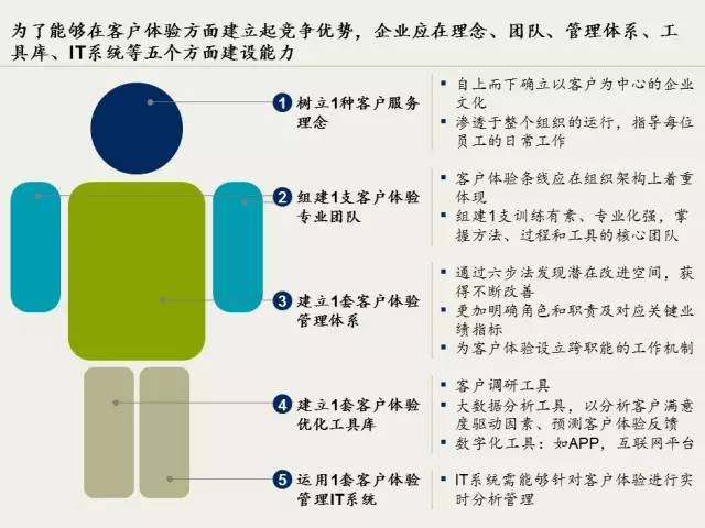 根据我们服务于各领域客户的经验,企业应从理念、团队、管理体系、工具库、IT系统等五方面建设能力,打造卓越客户体验,从而形成新的竞争优势(见下图)。