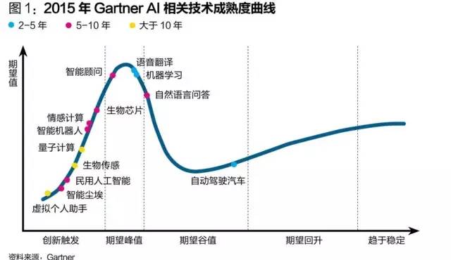 投资人工智能公司,需要专业技术知识和长线投资眼光。根据Gartner的“智能机器炒作周期图”,由人工智能驱动的应用中,语音识别产业化最高,自动驾驶汽车和智能顾问处于炒作最高点,智能机器人、自然语言处理/生成和虚拟个人助手则处于爬坡期。这些都属于5年-10年内能广泛普及的颠覆性技术。而神经形态硬件(如神经元芯片等)属于10年以后才能普及的技术,但该技术可能还没研发成熟就被淘汰了。