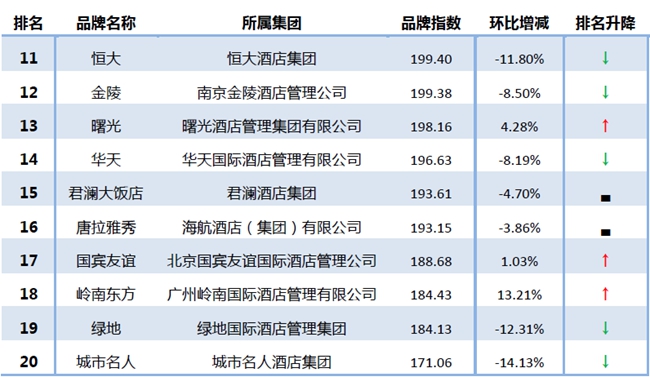 具体来看,名次上升的酒店品牌排名中,凯莱大饭店以8个位次的上升幅度位列第一;岭南东方和岭南花园均较上月提高了7个位次,位列第三及第四名。曙光和明宇丽雅均上升了6个位次,分列第四和第五名。