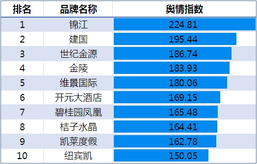 2016年5月,根据迈点旅游研究院(MTA)对国内高端酒店品牌品牌指数的不完全统计,本月国内高端酒店品牌风云榜TOP10依次是锦江、建国、开元大酒店、桔子水晶、开元名都、世纪金源、维景国际、碧桂园凤凰、海航、阳光。