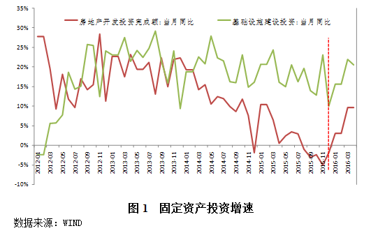 第一,房地产开发投资和基建投资增速出现明显复苏。1-4月份,全国固定资产投资完成额累计同比增长10.5%,增速比2015年全年提高0.5个百分点,比1-2月提高0.3个百分点。其中,1-4月基础设施投资累计同比增长19.7%,比2015年全年增速提高了2.4个百分点。房地产开发投资增速大幅度反弹,1-4月累计同比增长7.2%,比2015年全年增速提高了6.2个百分点。此外,截止4月底,新开工项目计划总投资12.9万亿元,累计同比增长38%,当月同比增长35.6%,远高于去年全年的5.5%,预示着未来一段时间固定资产投资增速可能继续有所加快。