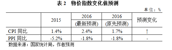综合考虑近期及未来大宗商品和食品价格走势、宏观政策的滞后影响和产出缺口变动等因素,我们将2016年居民消费物价指数(CPI)涨幅预测上调至2.4%(上调0.7个百分点),同时维持全年PPI下降1.8%的预测不变。我们对全年价格涨幅的最新预测如下表。