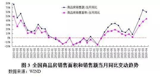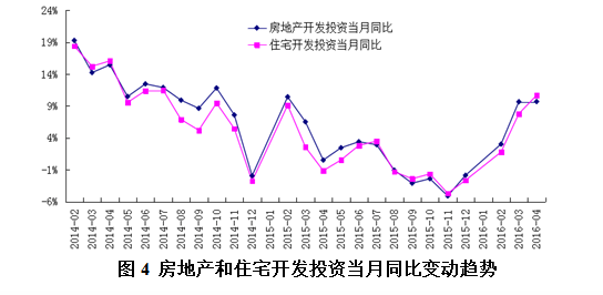 经过一年多的调整之后,自2015年5月开始,不论百城住宅价格指数还是70个大中城市新建住宅价格指数都开始止跌回升。从房价上涨范围看,全国70个大中城市新建商品住宅价格同比上涨的城市也明显增多。同时,房地产销售面积和销售额企稳回升,2015年全年销售面积和销售额分别增长了6.5%和14.4%。今年前四个月,商品房销售面积和销售额继续保持增长势头,其4月的同比增速已分别加快到44.1%和59.8%(见图3)。