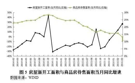 随着房地产销售升温,2015年末房地产与住宅开发投资开始触底反弹,今年前四个月加速上升,分别增长7.2%和6.4%。4月份房地产开发投资当月同比增速已经恢复到9.7%,大幅高于去年年均1%左右的增速(见图4)。与此对应,反映房地产市场景气状况的国房景气指数,从2015年6月也保持了平稳向好走势。房屋新开工面积同比增速大幅反弹,商品房待售面积增速继续回落。2015年底房屋新开工面积累计同比下降14%,而今年1-4月却累计增长21.4%,4月房屋新开工面积的当月同比增速已经恢复到25.9%(见图5)。导致新开工面积增速大幅反弹的主要原因是房地产销售持续回暖、政府对保障性住房的政策支持和基数较低。同时,由于销售回暖,商品房待售面积同比增速继续回落。