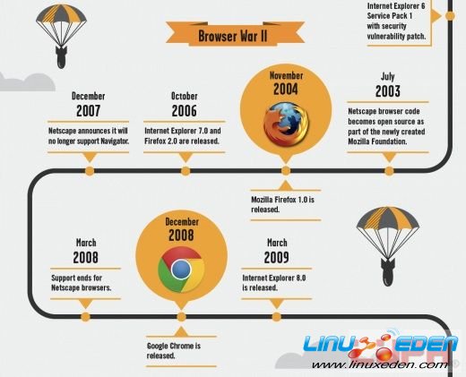 第二次浏览器大战,以 2004 年 11 月 Firefox 1.0 诞生为标志,IE 的地位开始受到以 Firefox 为首的其它浏览器挑战。而后在 2008 年 12 月 Google 开发的 Chrome 诞生,向市场投放了一颗重磅炸弹。