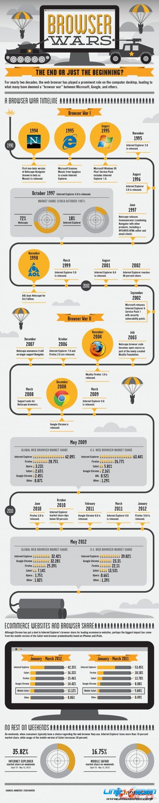 Monetate 制作了一张信息图,让我们回顾历次浏览器大战的情况。之前在写 Marc Andressen 的时候,我已经详细回顾了第一次浏览器大战的情况,因此在文中不再赘述。而从信息表中,也可得知 IE 在获得浏览器大战的胜利之后,从 2001 年到 2004 年,IE 在发布 IE 6.0 后获得了三年安稳的好时光,市场上没有一个像样的竞争对手出现,可谓“独孤求败”。