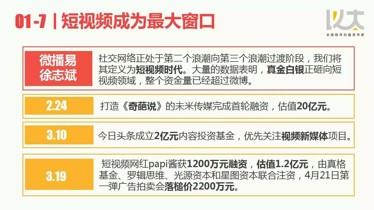 网红行业研究:进击的短视频昭示网红新趋势 去年开始,网红成为热词,并伴随着内容春天的到来成为投资和创业风口,短视频网红papi酱获得1200万投资,更将网红经济推向新一轮热潮。《网红行业研究:进击的短视频昭示网红新趋势》由以太研究院推出,主要对短视频浪潮下,网红行业的市场格局、机会、挑战、未来趋势等进行了研究分析。 研究员:管艺雯,特别感谢:以太投资经理张慧、王珏、刘晓璐 更多阅读:Topdigital&妈妈帮:2015年中国母婴互联网营销新思维与新趋势新榜:2016年3月“网红排行榜”100强榜单欢聚集团:1Q20财报电话会议实录 营收 利润将持续增长 短视频业务在海外无主要竞争对手展望2025汽车行业新趋势,最值得关注的三大变化2017全球新闻传播新趋势2017年网络营销新趋势影响未来营销界格局的10大社交媒体新趋势影响未来营销界格局的10大社交媒体新趋势2014年值得关注的数字分析新趋势摩托罗拉移动:家庭影视内容消费新趋势Snapchat:2024年网红营销报告IZEA:2023年意见领袖收入报告阿里:网红互联网消费影响力指数Ampere:调查显示全球超60%的网民每天刷短视频中国青年报社:调查称近9成用户喜欢刷短视频 年龄越小兴趣越大