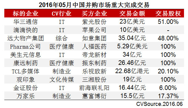 在今年5月份完成的重大并购交易案例中,紫光股份23亿美元收购华三通信51%股权和苹果公司10亿美元注资滴滴快的,分别位列本月并购市场完成交易规模前两名(见表2)。