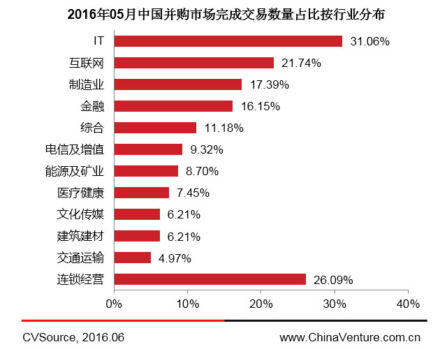 图3 2016年05月中国并购市场完成交易数量按行业分布
