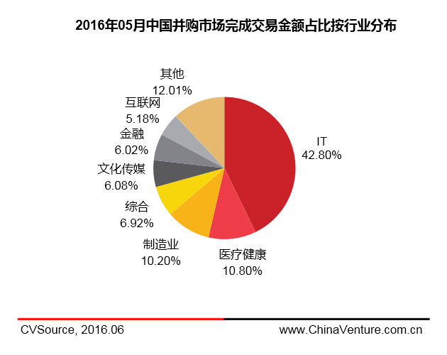 就完成并购交易数量的行业分布来看,在5月份中国并购市场交易完成案例中,IT行业以完成交易案例数量50起位居首位,占比31.06%;互联网、制造业以完成交易案例数量35起、28起位列二、三位,占比分别为21.74%、17.39%。就完成并购交易披露交易规模的行业分布来看,IT行业、医疗健康、制造业交易规模分别为69.83亿美元、17.62亿美元、16.64亿美元,占比分别为42.80%、10.80%、10.20%,交易规模居前三甲。