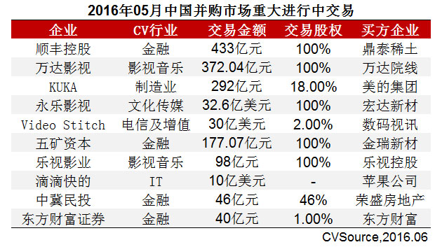 表1 2016年05月中国并购市场重大进行中交易