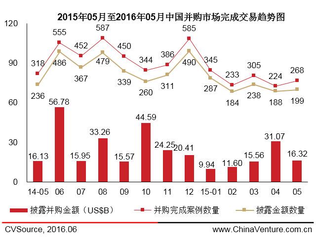图2 2015年05月至2016年05月中国并购市场完成交易趋势图