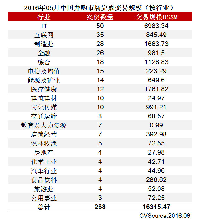 表3 2016年05月中国并购市场完成交易规模(按行业)